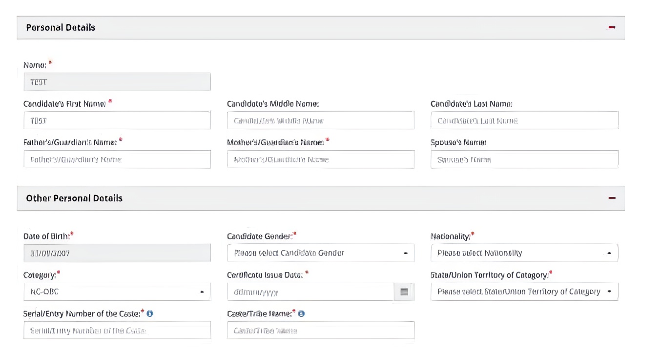 • Personal Details: Name, contact information, category (General/SC/ST/OBC), etc.