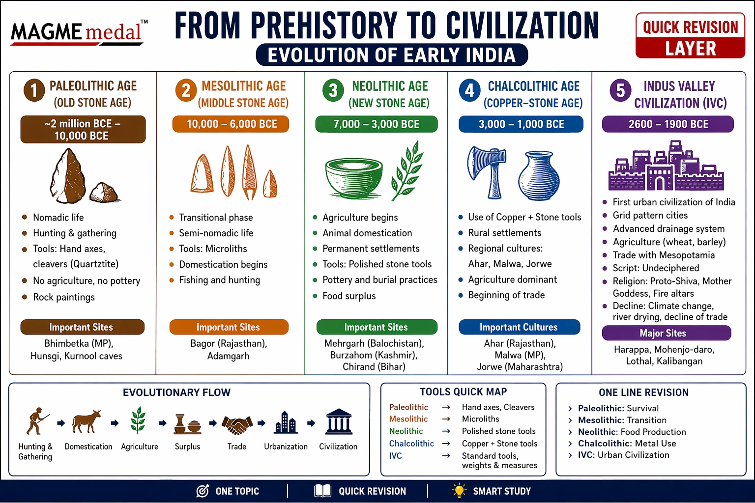 👉 Paleolithic → Mesolithic → Neolithic → Chalcolithic → Indus Civilization